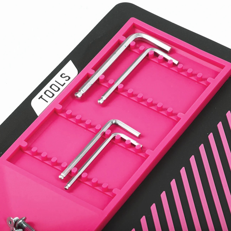 Il vassoio portautensili scanalato, il vassoio magnetico per i pezzi e il bordo rialzato impediscono a piccoli oggetti come viti, molle o cuscinetti a sfera di rotolare via dalla superficie di lavoro. Il logo in rilievo offre una presa sicura per il pennarello senza graffiarlo, garantendo un'area di lavoro stabile e delicata.