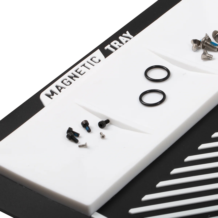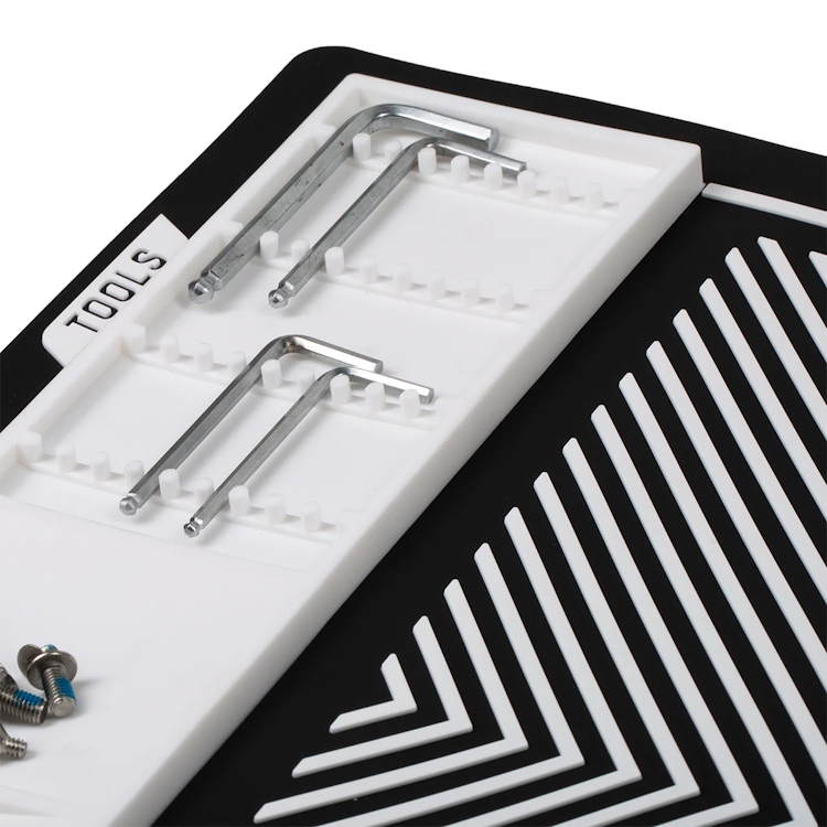 Il vassoio portautensili scanalato, il vassoio magnetico per i pezzi e il bordo rialzato impediscono a piccoli oggetti come viti, molle o cuscinetti a sfera di rotolare via dalla superficie di lavoro. Il logo in rilievo offre una presa sicura per il pennarello senza graffiarlo, garantendo un'area di lavoro stabile e delicata.