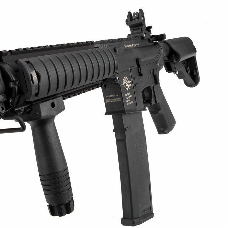 La serie Core rappresenta la serie ridotta ed economica, si caratterizza in particolare per il corpo, la bacchetta e l'impugnatura in plastica rinforzata con nylon. Il paramano e la canna esterna sono realizzati in alluminio come parti esterne sollecitate. Oltre a una maniglia, il primo ha anche due piastre rigate sulle guide RIS circostanti. Tuttavia, questi possono essere utilizzati anche per montare una maniglia o qualcosa di simile, ad esempio. Oltre a ospitare la batteria, il palo rende anche molto facile fissare un'imbracatura con l'apposito girello per imbracatura QD con il suo attacco QD. Un RIS superiore sul ricevitore superiore, che ha già un mirino ribaltabile, è disponibile per tutti i tipi di ottica. Oltre alle marcature del produttore Rock River Arms, responsabile della produzione della tagliente piattaforma AR15 negli Stati Uniti, questo moderno softair, nel classico design M4, ha anche Specna Arms profondamente inciso e un numero di serie individuale, che è identificato da un ulteriore ologramma è confermato. Una canna da 6,03 mm, cuscinetti a strisciamento da 8 mm e ingranaggi in acciaio spessorato sono stati installati franco fabbrica.